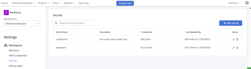 Workspace members with the correct permissions can edit or delete a secret by clicking the Edit or Delete icon in the Action column.
