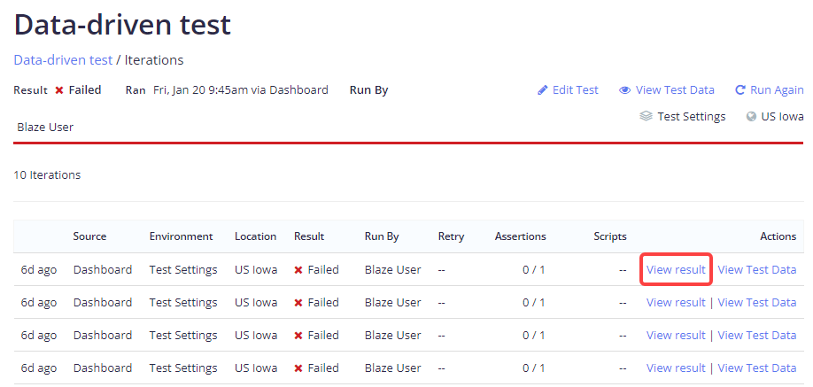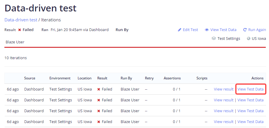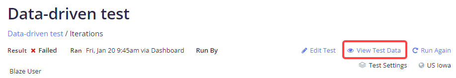 Clicking View Test Data next to the test name in the Iterations view will show all the data lines used in all the iterations. -