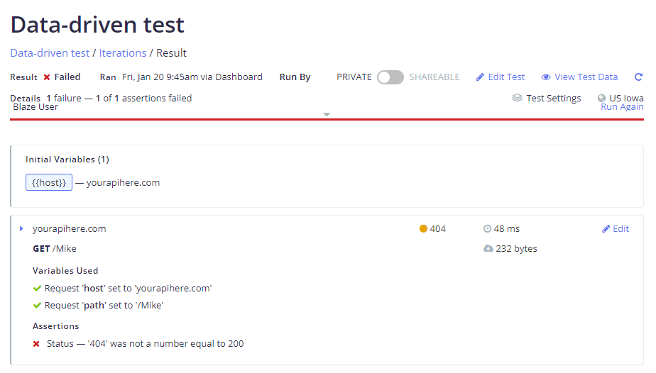 You can now add data parameters using the test data variables in your Request and Assertions sections, much like regular variables. For more information, see Dynamic Data and Request Chaining.