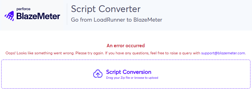 When using the ShiftLeft Converter, occasionally the following error message appears after you uploaded your LoadRunner script: