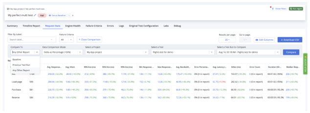 Building on the recently introduced enhanced single-test Request Stats comparison, BlazeMeter now extends this capability to multi-test comparisons. Users can compare performance metrics across multiple tests in a tabular format to identify any degradation in system performance and pinpoint the specific labels/endpoints where issues occurred. This feature is available to all users on all plan types.