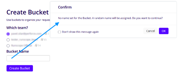 To help prevent accidental creation of Buckets with default or placeholder names, BlazeMeter now displays a confirmation prompt when a user attempts to create a Bucket without specifying a name.